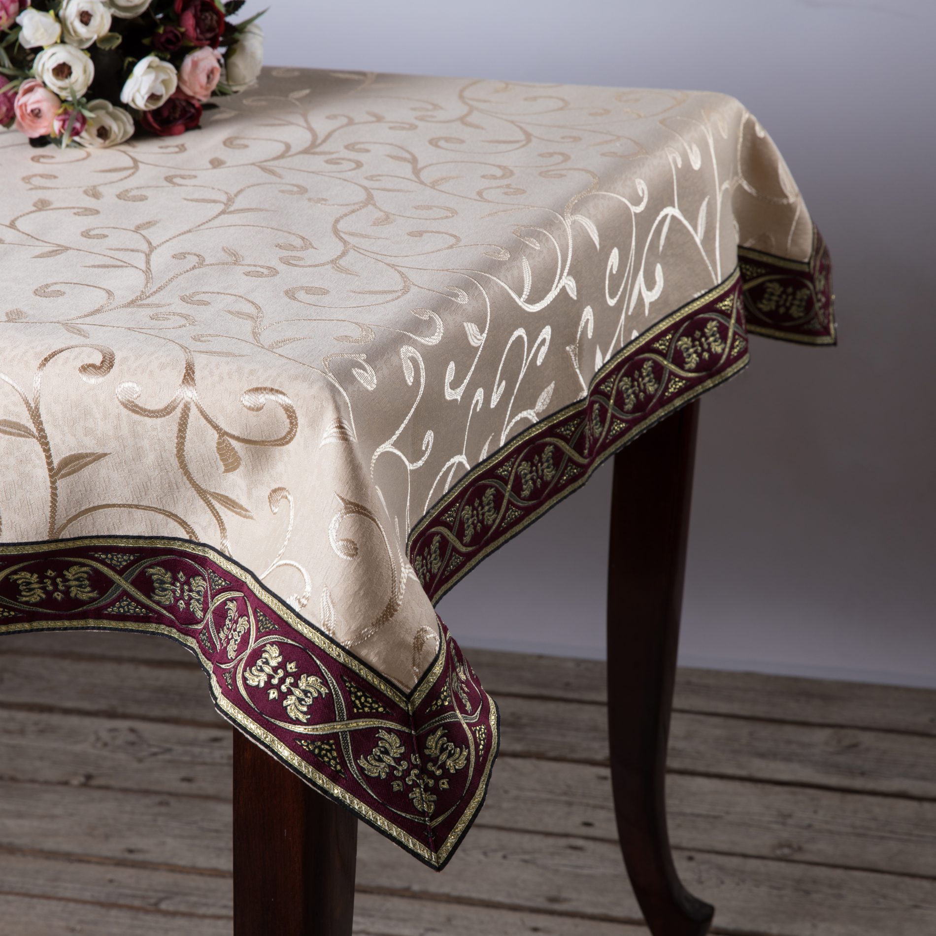 A unique tablecloth made from synthetic fabrics. Will not shrink. Decorated with colorful embroidered ribbons and laces.